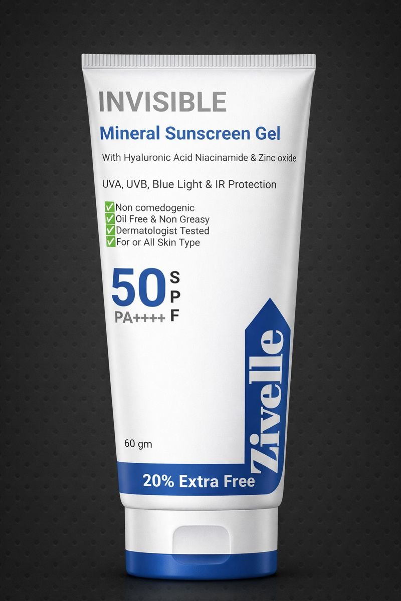 Zivelle Invisible Mineral Sunscreen Gel SPF 50 PA++++ provides broad-spectrum protection against UVA, UVB, Blue Light, and IR rays. Formulated with Zinc Oxide, Hyaluronic Acid, and Niacinamide, it protects skin from sun damage while keeping it hydrated, calm, and balanced. The ultra-light, oil-free, non-greasy, non-comedogenic gel blends effortlessly with no white cast, making it perfect for daily use on all skin types. Dermatologically tested.